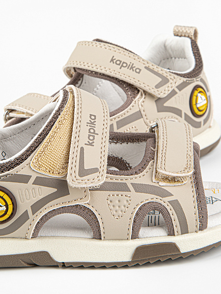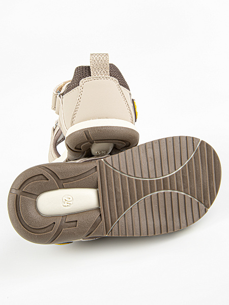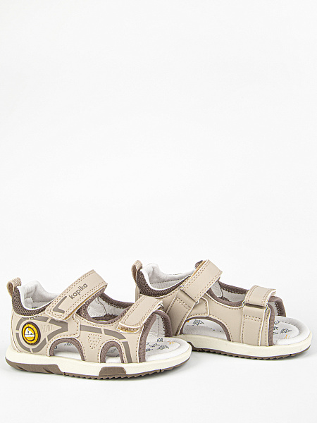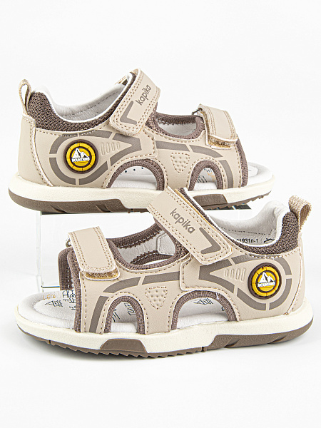 Сандалии бежевого цвета для мальчика, в спортивном стиле. Липучки надежно фиксируют модель на ножке. Открытая носочная часть и высокая закрытая пятка. Верх выполнен из качественной экокожи. Стелька и подкладка - из натуральной кожи. Прочная и долговечная подошва из термоэластопласта.