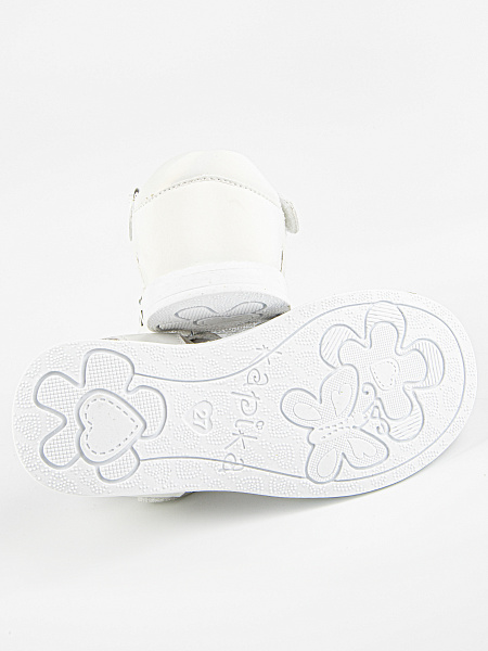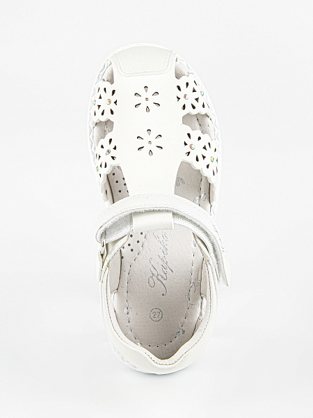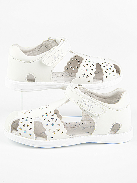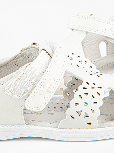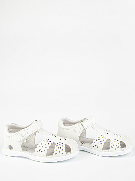 Закрытые сандалии белого цвета, декорированные перфорацией. Верх изделия выполнен из качественной экокожи. Подкладка и стелька выполнены из натуральной кожи. Прочная и устойчивая подошва из термоэластопласта. Внутри имеется подсводник, который поддерживает продольный свод стопы и обеспечивает правильное положение ноги ребенка при ходьбе.