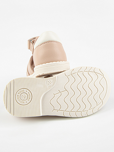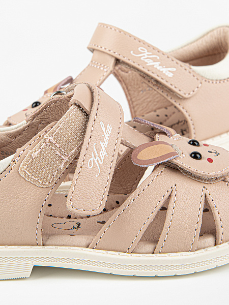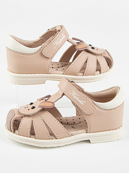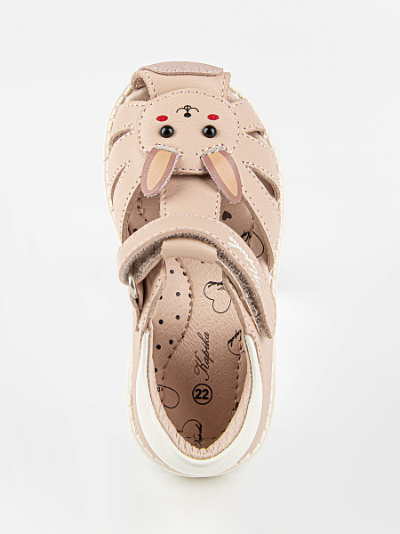 Закрытые сандалии розового цвета с декором в виде зайчика. Выполнены полностью из натуральной кожи. Прочная и устойчивая подошва из термоэластопласта. Внутри имеется подсводник, который поддерживает продольный свод стопы и обеспечивает правильное положение ноги ребенка при ходьбе.