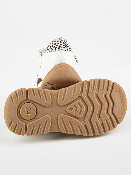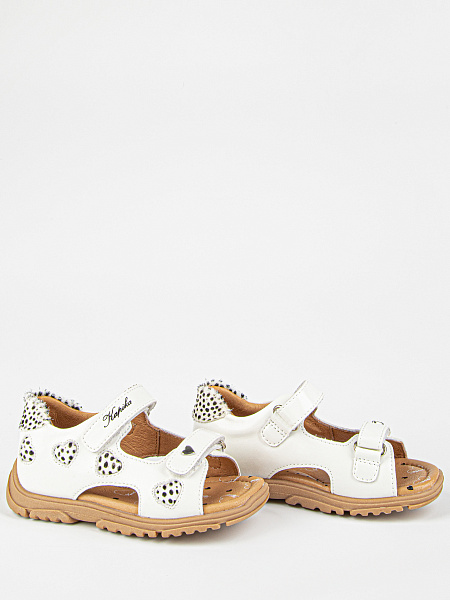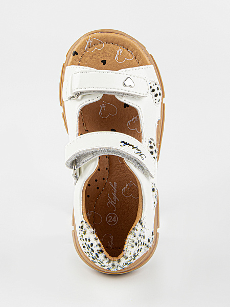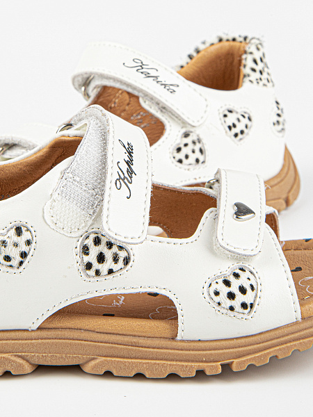 Легкие сандалии белого цвета с декором в виде сердечек надежно фиксируются на ножке с помощью липучек. Верх выполнен из комбинации натуральных и искусственных материалов. Стелька и подкладка выполнены из натуральной кожи. Внутри имеется подсводник, который поддерживает продольный свод стопы и обеспечивает правильное положение ноги ребенка при ходьбе. Надежная подошва из термоэластопласта защищает от неровностей поверхности.