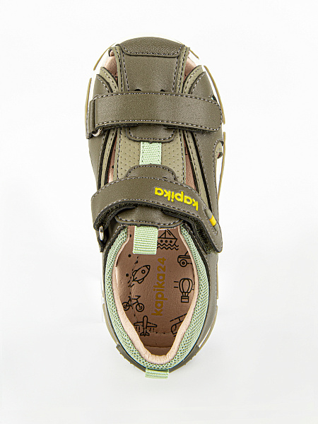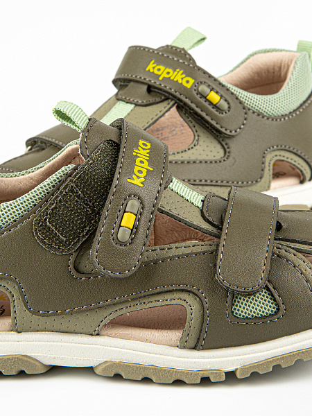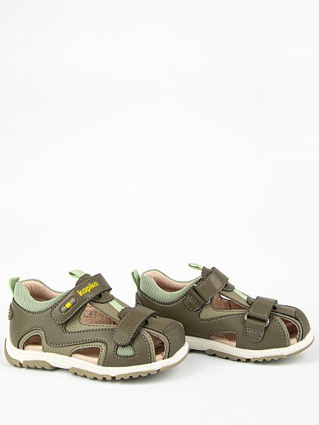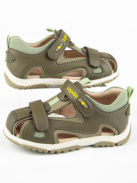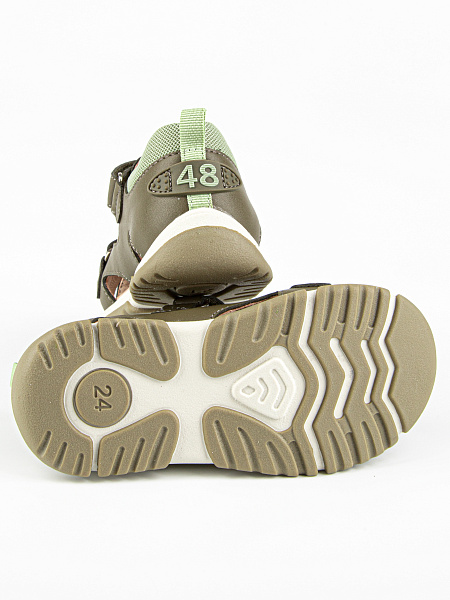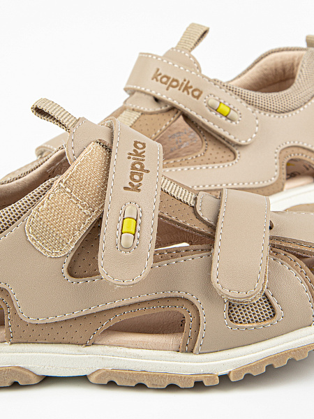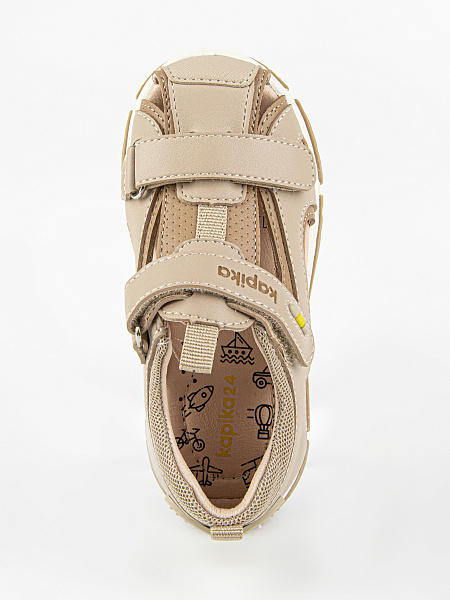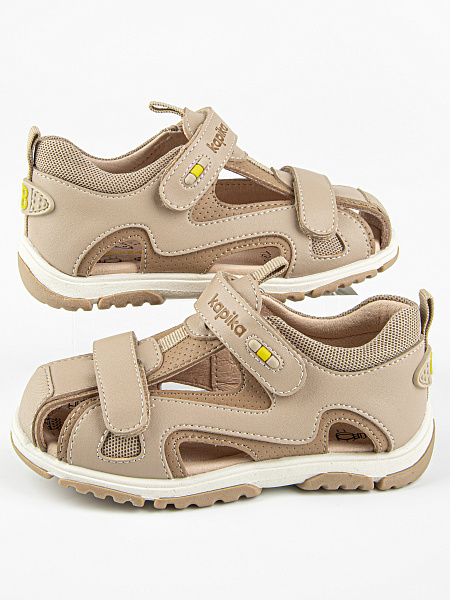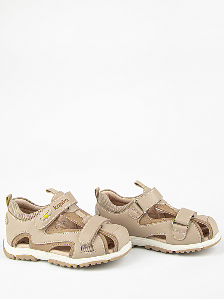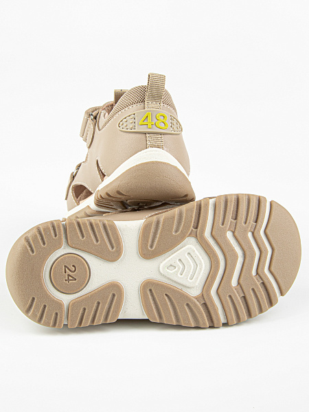 Закрытые сандалии бежевого цвета из комбинации качественной экокожи и текстиля. Стелька и подкладка выполнены из натуральной кожи. Внутри имеется подсводник, который поддерживает продольный свод стопы и обеспечивает правильное положение ноги ребенка при ходьбе. Надежная подошва из термоэластопласта защищает от неровностей, отличается долговечностью и устойчивостью к износу.