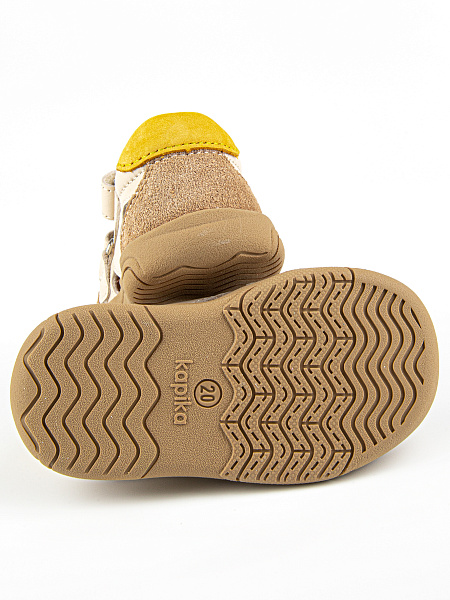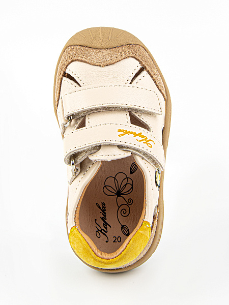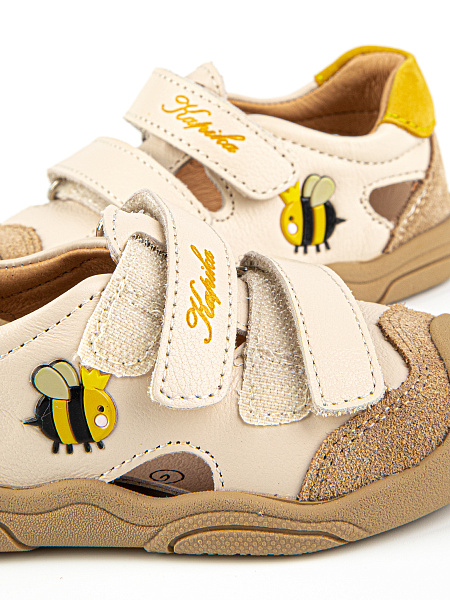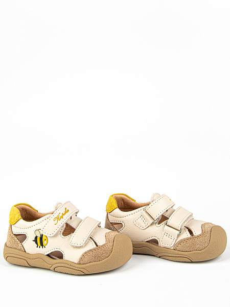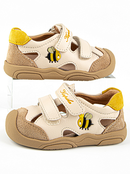 Модель закрытых сандалий бежевого цвета, со специальной резиновой защитой носовой части обуви от истирания, а также с подошвой, которая заходит на носок обуви, что также является дополнительной защитой. Выполнены полностью из натуральной кожи. Подошва из резины гибкая и прочная.