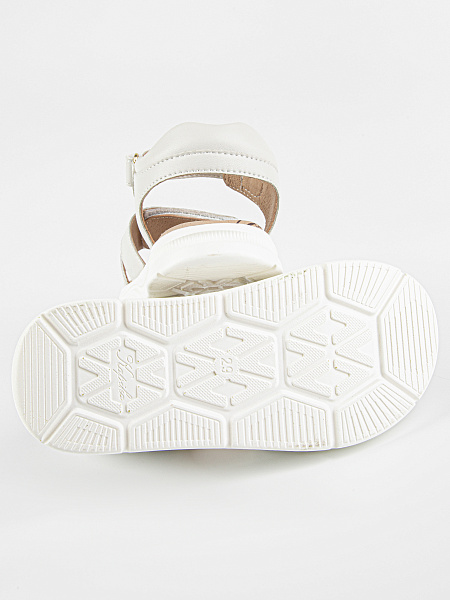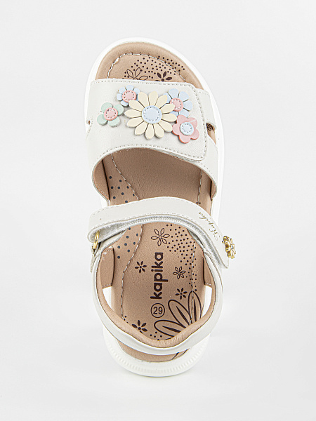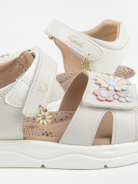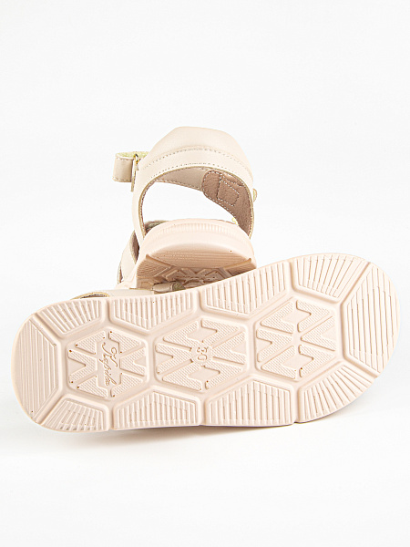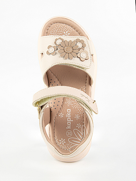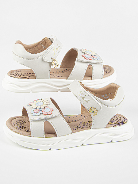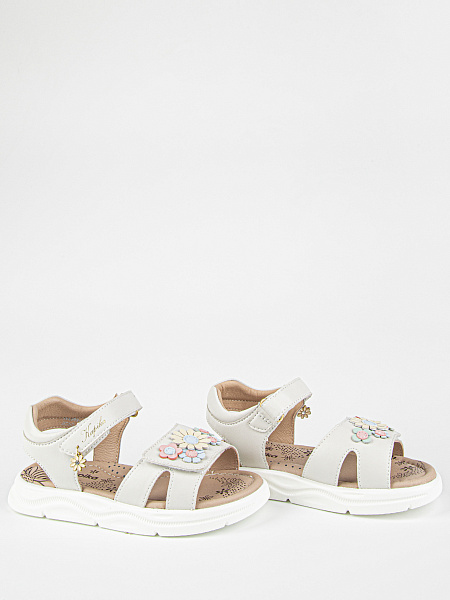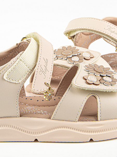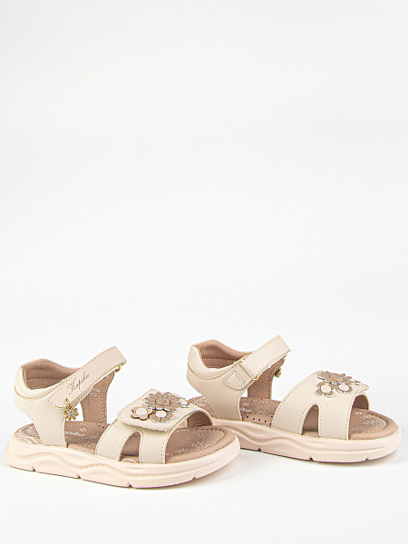 Открытые босоножки бежевого цвета, декорированные цветочной аппликацией. Стелька и подкладка выполнены из натуральной кожи, а верх изделия - из качественной экокожи. Комбинированная подошва из материалов ЭВА и резина обеспечивает легкость, гибкость и износостойкость.
