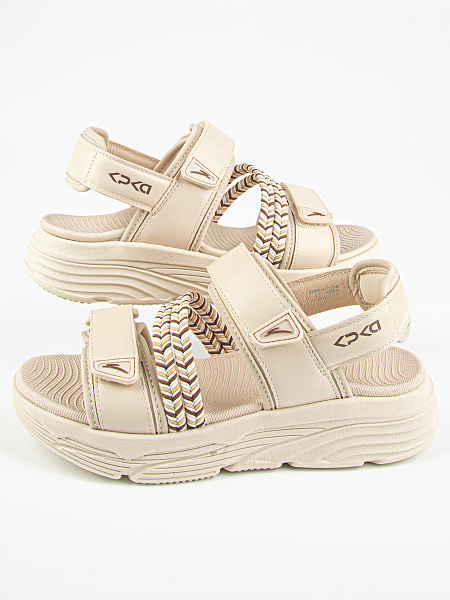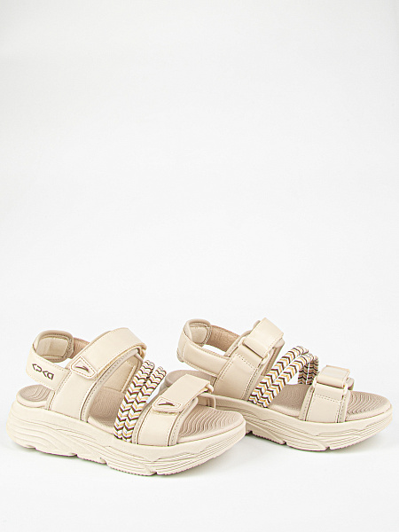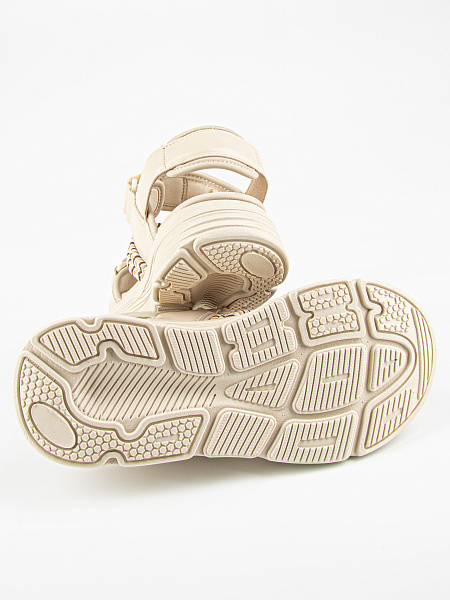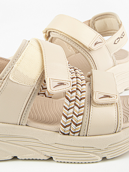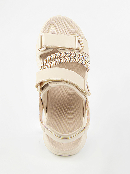 Открытые босоножки бежевого цвета с вставками в виде пестрых текстильных резинок. Подкладка из комбинации текстиля и натуральной кожи. Стелька из материала ЭВА обладает высокой прочностью и долговечностью, не теряя форму и свои свойства даже при интенсивном использовании. Комбинированная подошва из материалов ЭВА и ТЭП гибкая, легкая и стойкая к износу.