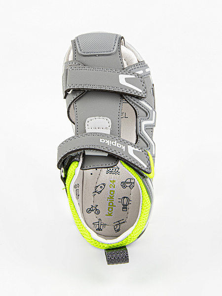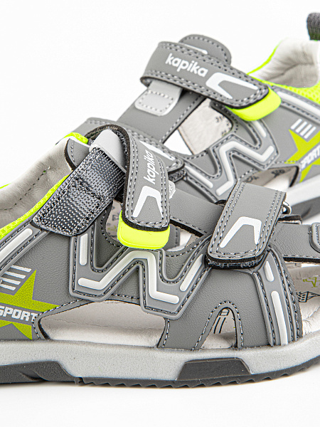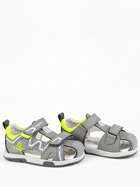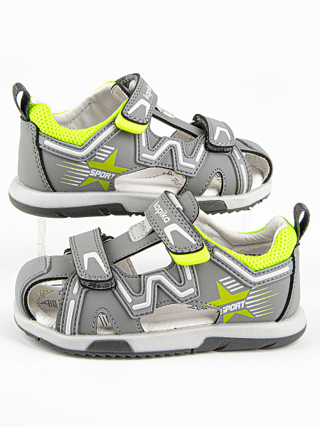 Закрытые сандалии серого цвета из качественной экокожи. Стелька и подкладка выполнены из натуральной кожи. Внутри имеется подсводник, который поддерживает продольный свод стопы и обеспечивает правильное положение ноги ребенка при ходьбе. Надежная подошва из термоэластопласта защищает от неровностей, отличается долговечностью и устойчивостью к износу