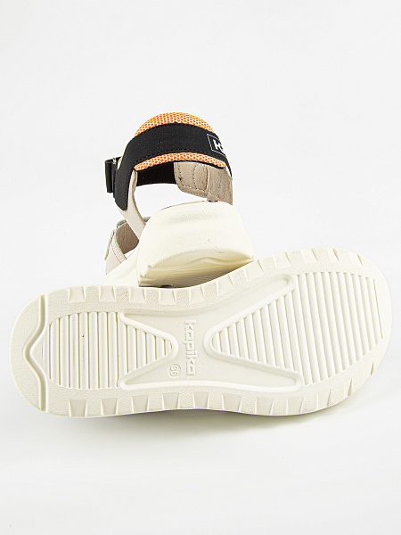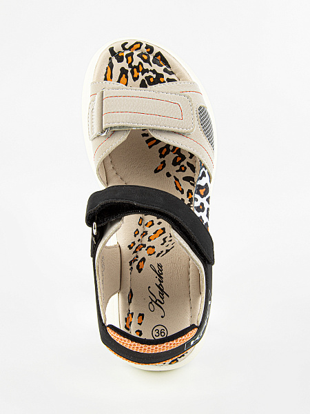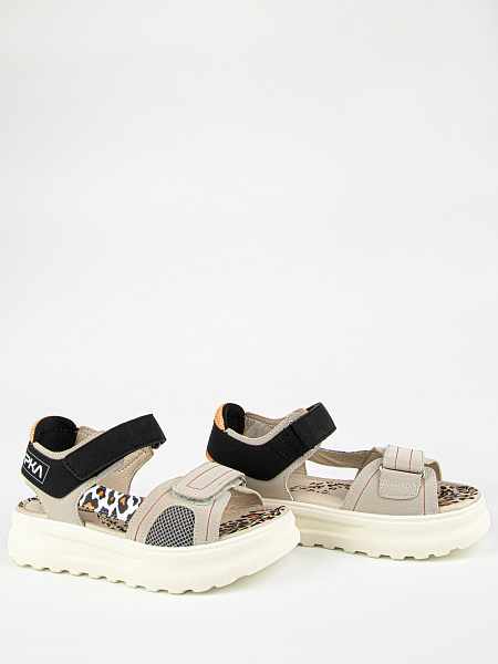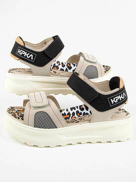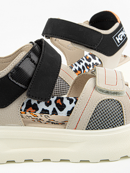 Открытые сандалии бежевого цвета с контрастными вставками с текстовым и анималистичным принтом. Верх изделия выполнен из комбинации качественной экокожи и текстиля. Подкладка и стелька выполнены из натуральной кожи, что обеспечивает комфорт и экологичность. Массивная, но очень легкая и гибкая подошва из полиуретана обеспечивает отличную амортизацию при ходьбе.